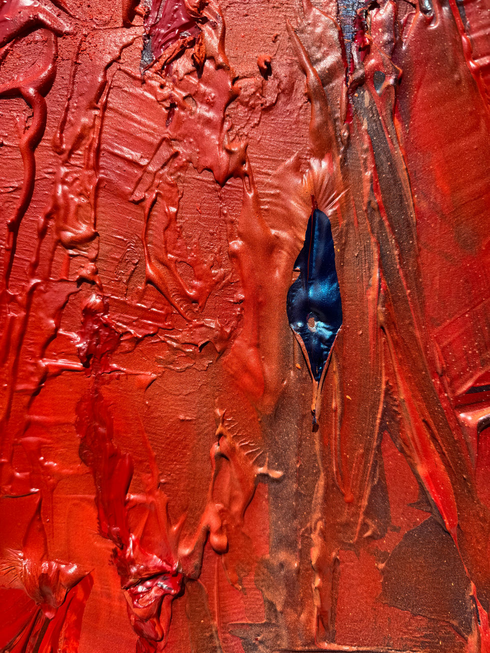 A bold exploration of identity and transhuman introspection, Cognitive Rebirth juxtaposes the organic human profile with synthetic augmentation. Set against a densely layered crimson backdrop, the subject appears as a spectral hybrid half-machine, half-memory conveyed through heavy impasto textures and a stark chromatic dichotomy between white and red. The visceral brushwork evokes both anatomical rawness and digital disintegration, challenging the viewer to contemplate the convergence of emotion and circuitry.